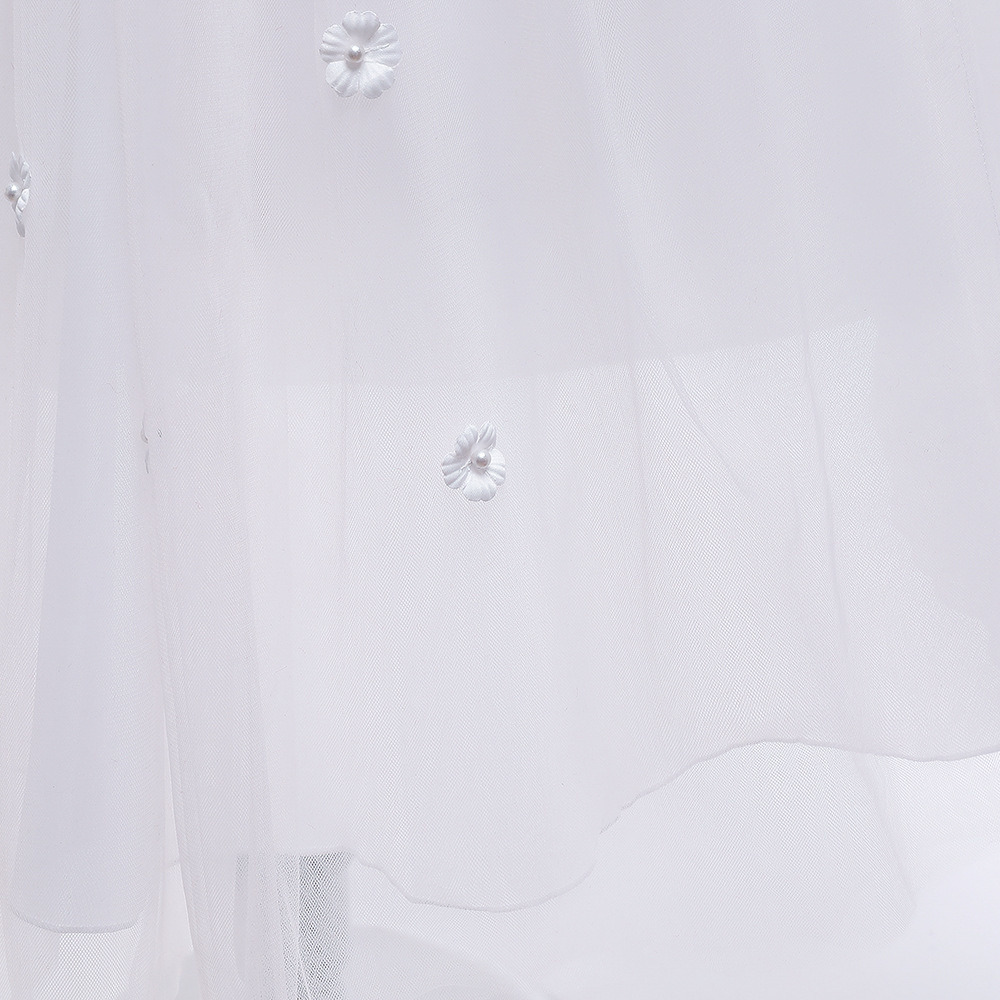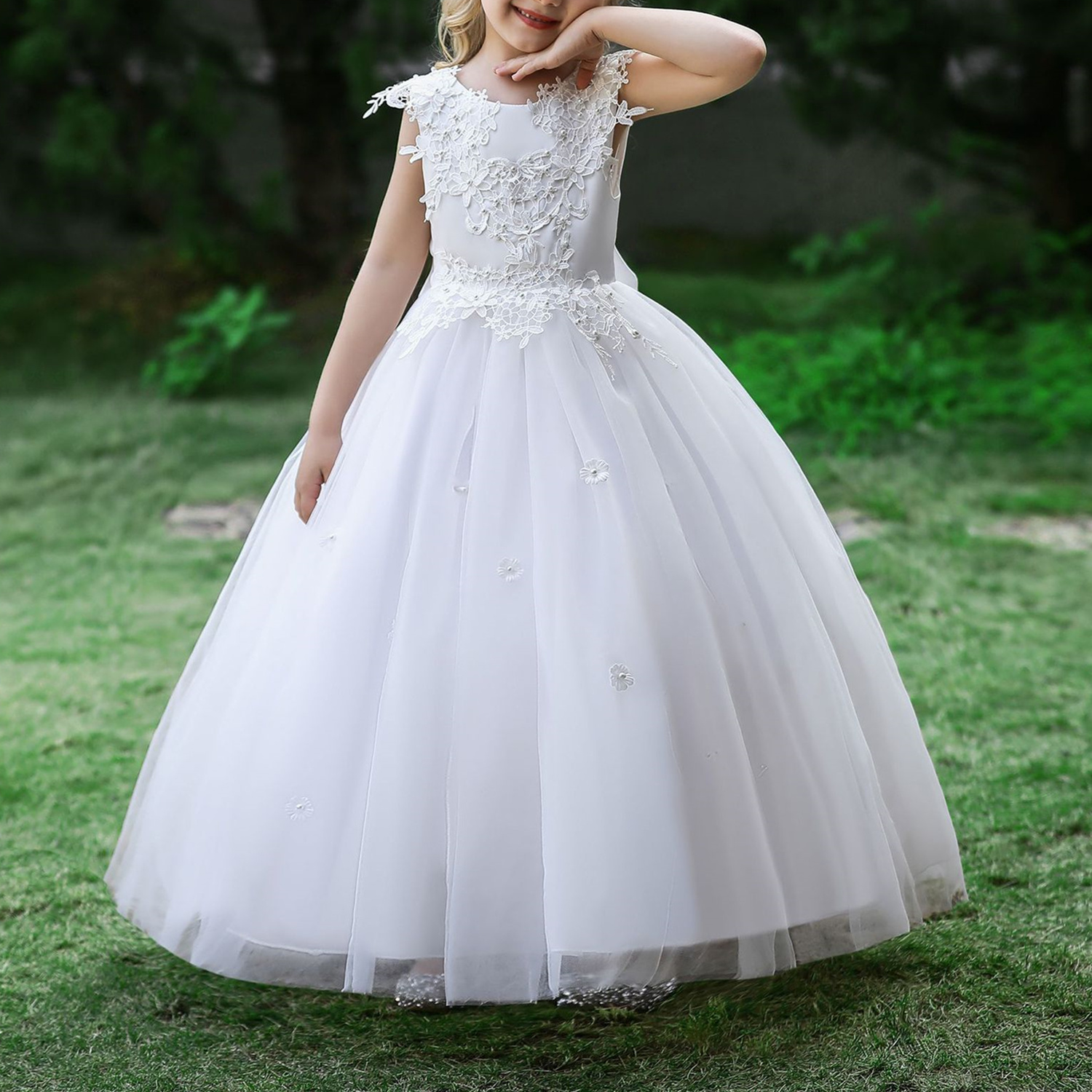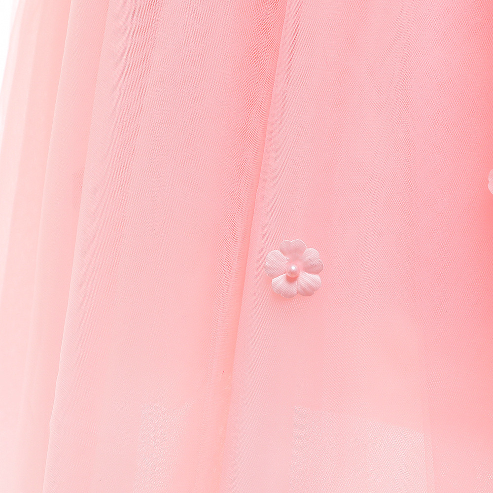 1. Design: Features a fluffy bubble skirt with a bow at the back, a sleeveless crew neck adorned with lace flower trim on the bodice, and a tulle hem with a layer of lining for added volume and comfort.
