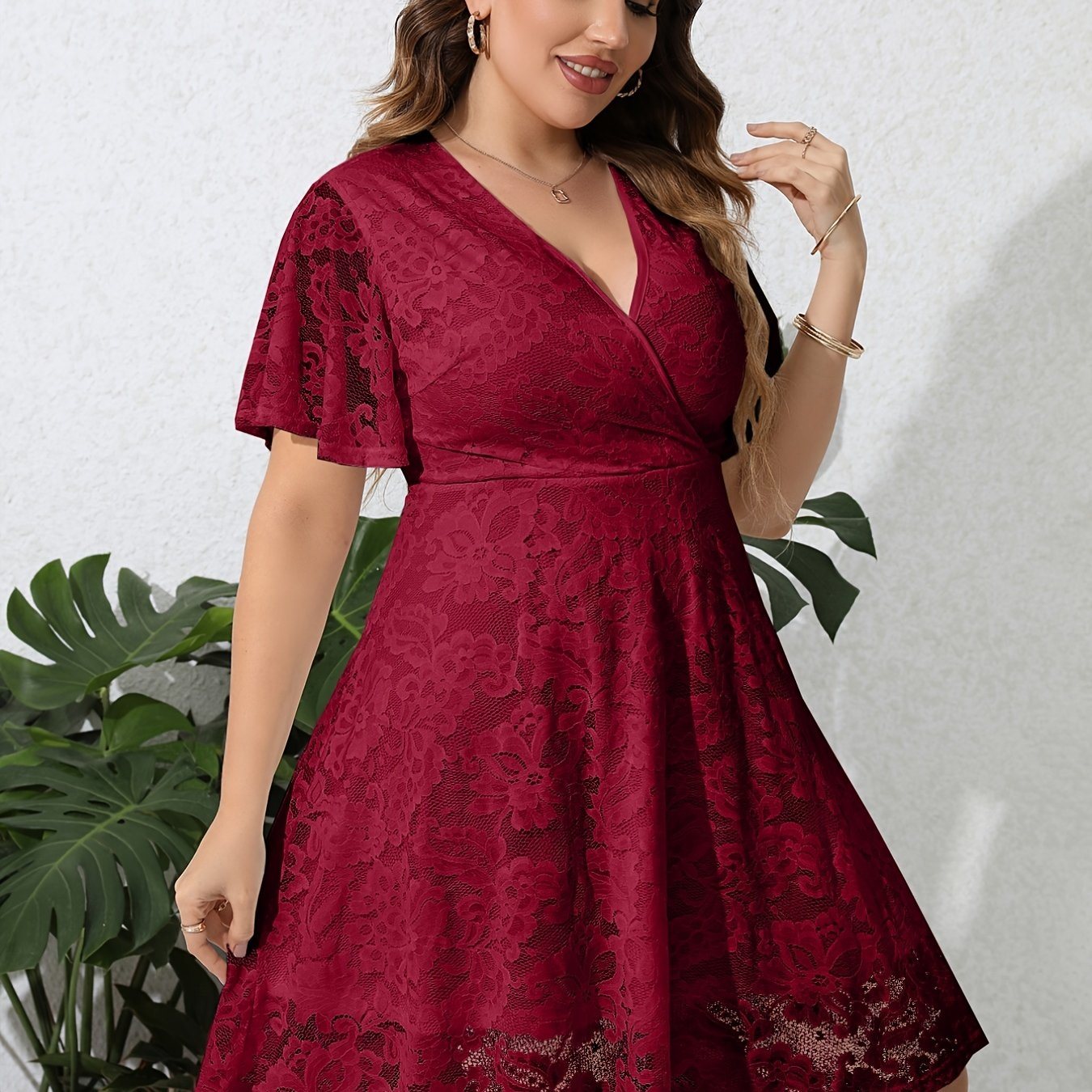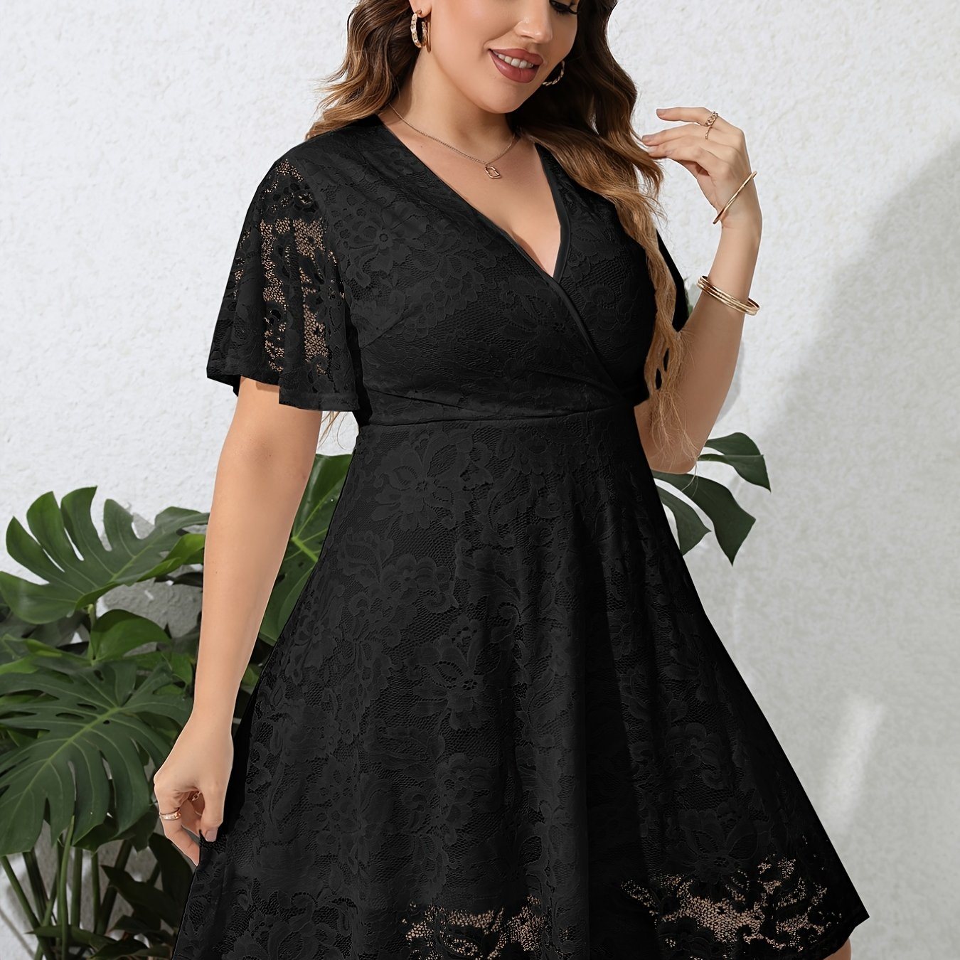 Capture Elegance with Our Plus Size Contrast Lace V Neck Ruffle Hem Midi Dress