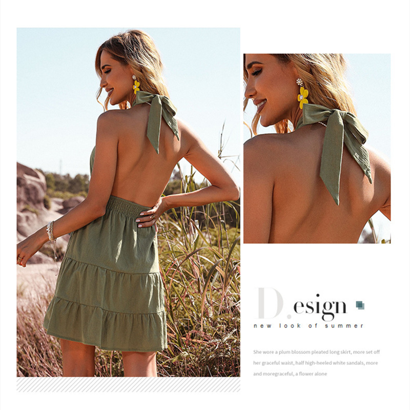 Summer Cotton Linen Short Dress Backless Sexy Elastic High Waist Pleated Hollow Green Beach Slip Skirt Halter Neck High Quality