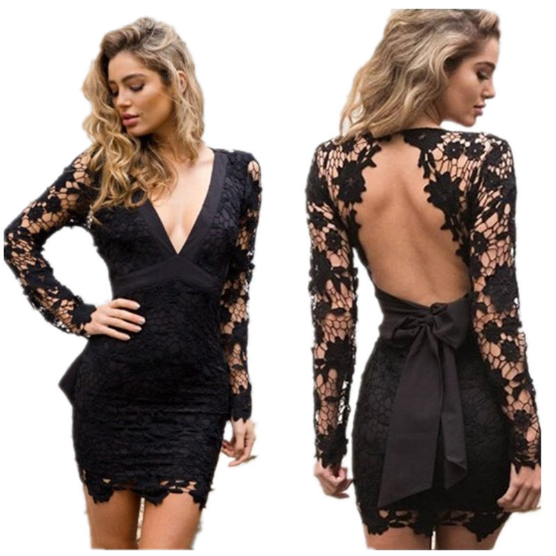 Women Fashion Hollow Lace Backless Dress Sexy Deep V-neck Party Dresses Halter Dress Spring Summer Lace Dress Package Hip Dress Sweety Tops